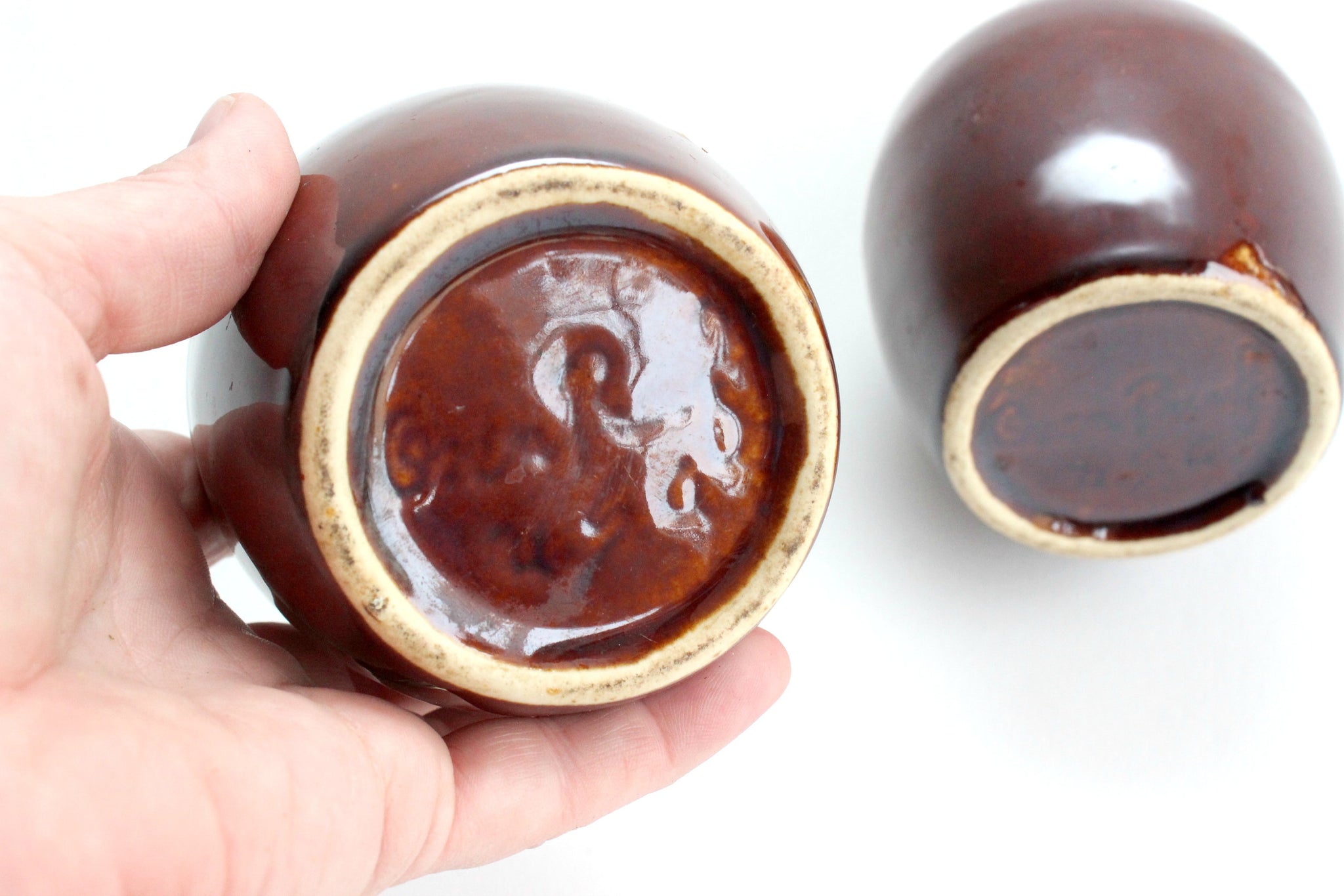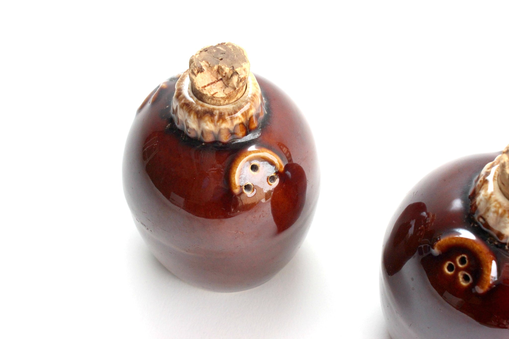 PRODUCT DESCRIPTION Pair of vintage stoneware salt and pepper shakers with cork toppers. One is marked the "salt" and the other "pepper." Shiny brown glaze. Marked USA on bottom. CONDITION Vintage/used condition. One of the corks has a little chunk missing. Natural imperfections can be seen. SIZE Both measure 3 inches wide and 4 inches tall. SHIPPING Overpaid shipping charges will be refunded when item(s) ships. If you are planning to purchase multiple items, contact me for a combined shipping rate, as this is sometimes possible. Free pick-up from zip code 91710 can be arranged. Enter coupon code: FREEPICKUP at checkout and leave a message so we can schedule a time for you to pick-up. THANK YOU Thank you for stopping by my shop! If you have any questions please don't hesitate to send me a message. I will always try to respond with in 24 hours. Also, follow along on Instagram @mendezmanor and be the first to know when new listings hit the shop!