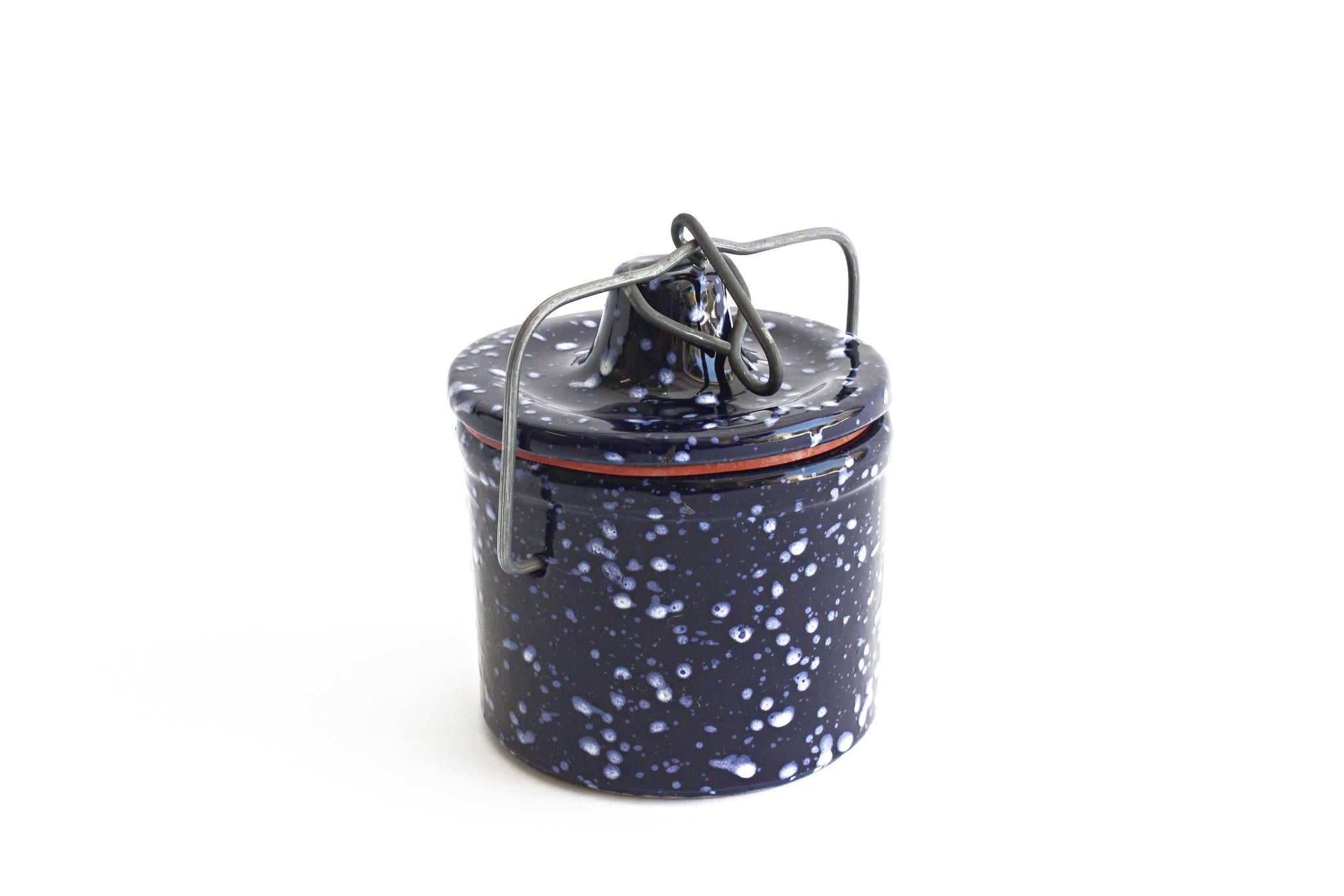 Vintage stoneware container with rubber seal and flip style metal lock. Navy blue ceramic jar with white speckles. Perfect for keeping coffee, tea, and spices.